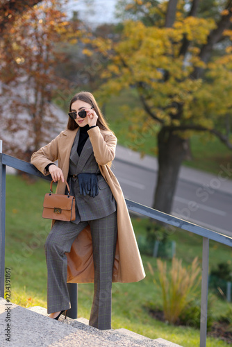 Fototapeta premium Businesswoman in stylish suit on stairs outdoors. Space for text
