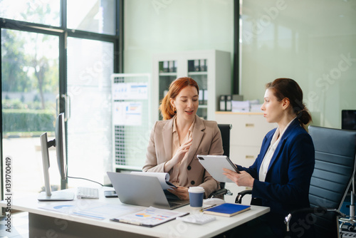 © laddawan, Fototapeta premium Businesswoman leading team meeting and using tablet and laptop computer with financial
