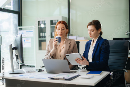 © laddawan, Fototapeta premium Businesswoman leading team meeting and using tablet and laptop computer with financial