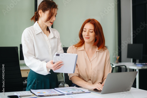 © laddawan, Fototapeta premium Businesswoman leading team meeting and using tablet and laptop computer with financial