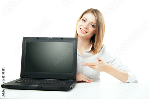 Naklejka premium Businesswoman showing laptop screen isolated