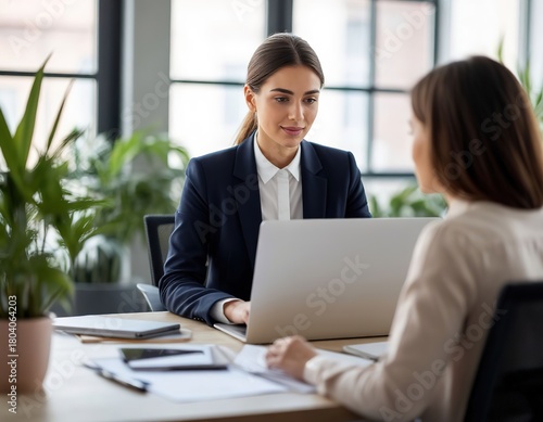 © Ирина Самойлова, Fototapeta premium Businesswoman smiling and working on a laptop in the office.