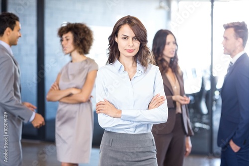 Obraz premium Businesswoman smiling at camera while her colleagues discussing