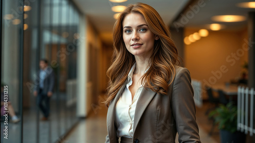 © okaro, Fototapeta premium Businesswoman smiling in modern office building