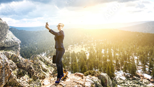 © Sergey Nivens, Obraz premium Businesswoman standing against landscape and making selfie . Mixed media