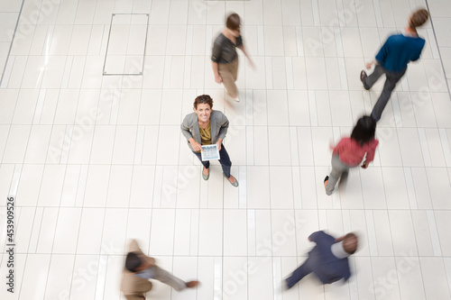 © KOTO, Obraz premium Businesswoman standing in busy office hallway