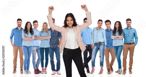 Fototapeta premium businesswoman team leader celebrating victory with her group