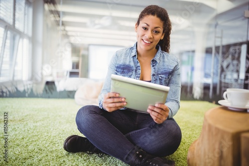 Obraz premium Businesswoman using tablet while sitting on carpet