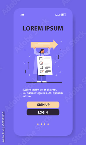 Fototapeta premium businesswoman with checklist holding arrow goal achievement concept vertical