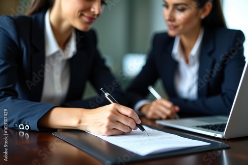 © Irtiko, Obraz premium Businesswomen reviewing contract in modern office