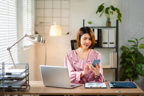© NINENII, Obraz premium Businesswomen using smartphone payments online shopping at office.