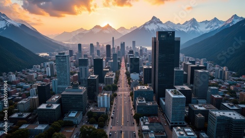 © Мария Цыренова, Obraz premium Bustling cityscape viewed from above, featuring a central artery flanked by towering structures and a prominent skyscraper to the right, encapsulating urban vibrancy