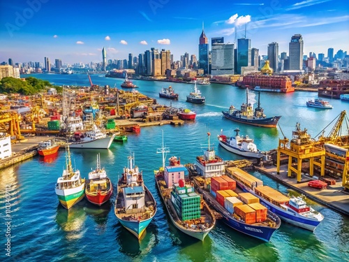 Fototapeta premium Bustling Harbour with Boats and Cranes on the Left Side, Showcasing Vibrant Activity and Copy Space for Text or Branding Use, Perfect for Maritime and Shipping Themes