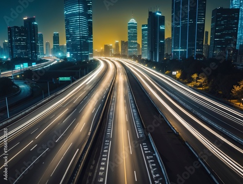 © Fathor, Fototapeta premium bustling highway in a modern city at night, streaks of car lights creating a dynamic flow, illuminated skyscrapers in the background,