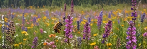 Obraz premium Busy bee collecting nectar from vibrant spring wildflowers , blossom, garden