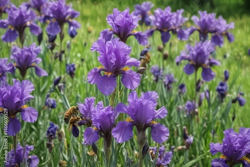 Naklejka premium Busy bees gather nectar from vibrant purple irises blooming in a lush green meadow , environment, ecosystem