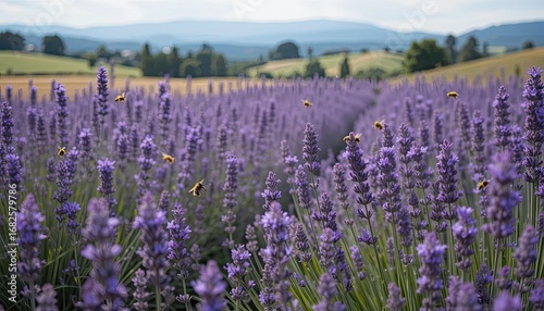 Naklejka premium Busy Bees Pollinating a Vibrant Lavender Field with Rolling Hills Beyond