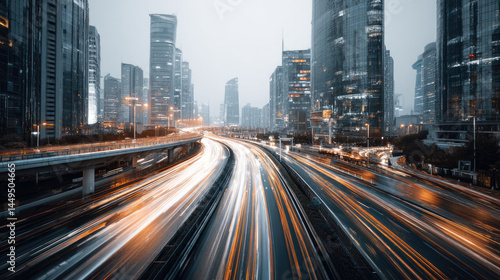 © jogeromonstero, Fototapeta premium Busy city highway at night, light trails. Modern skyscrapers in the background