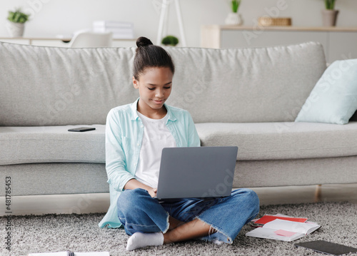 © Prostock-studio, Naklejka premium Busy concentrated teen afro american girl studying remotely, sitting on floor and look at laptop in living room