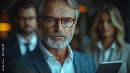 © SHI, Fototapeta premium Busy mature old business executives stand in the office using digital tablets. Middle-aged professional businessman, company manager, wearing a suit, wearing glasses, holding a tablet computer, workin