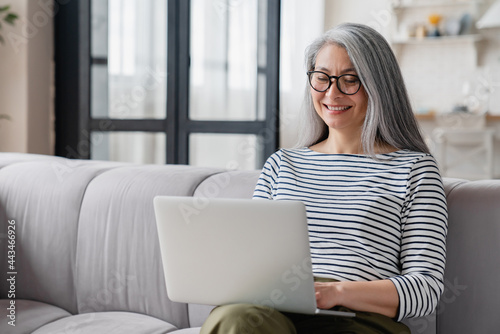 © InsideCreativeHouse, Naklejka premium Busy middle-aged mature businesswoman tutor mother wife using laptop for e-learning, searching web, online shopping, remote freelance work, watching movies.