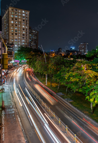 Fototapeta premium Busy traffic during sunset and night, colorful perspective of Ho Chi Minh...