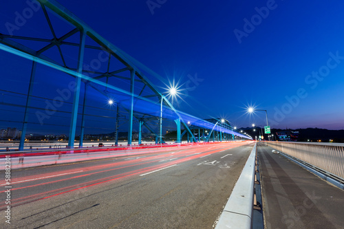 © leungchopan, Fototapeta premium Busy traffic on highway at night