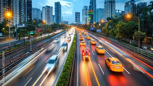 © Ai-Pixel, Fototapeta premium Busy urban highway with yellow taxis, speed motion blur, and city skyline during twilight hour in a vibrant metropolitan area.