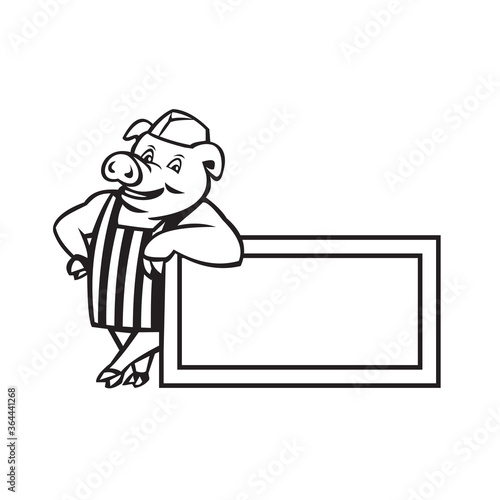 Fototapeta premium Butcher Pig Leaning On Sign or Signage Cartoon Black and White