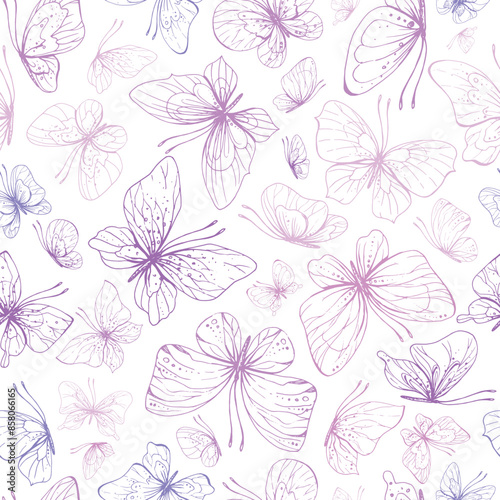 © NATASHA-CHU, Obraz premium Butterflies are pink, blue, lilac, flying, delicate line art, clip art. Graphic illustration hand drawn in pink, lilac ink. Seamless pattern EPS vector.