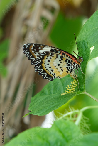 © Ombee, Obraz premium Butterfly and butterfly eggs on the Passiflora foetida plant.