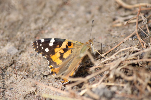 © Aleksey, Fototapeta premium Butterfly burdock sitting on the ground close-up.