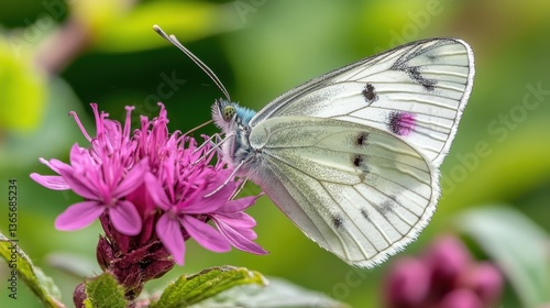 Naklejka premium Butterfly feeding on pink flower, garden, summer