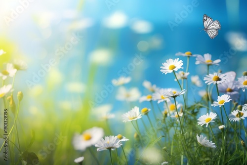 Fototapeta premium Butterfly flying over white daisy flowers in a vibrant spring meadow with blue sky