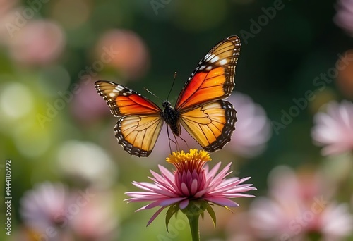 © Rans photography, Fototapeta premium Butterfly Gathering Nectar From Pink Flower in Garden