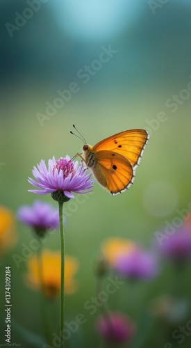 Naklejka premium Butterfly is sitting on a purple flower. The flower is surrounded by other flowers of different colors. The scene is peaceful and serene