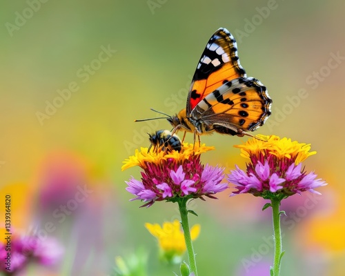 © Green Creator, Fototapeta premium Butterfly landing on a bee s back in a wildflower meadow, illustrating pollinator coexistence