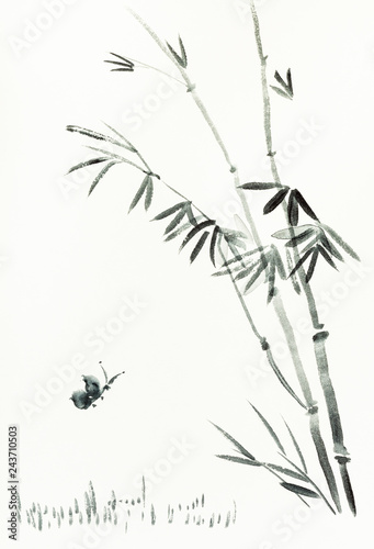 © vvoe, Naklejka premium butterfly near bamboo bush is hand drawn on paper