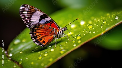 Fototapeta premium Butterfly on a Dew-Covered Leaf