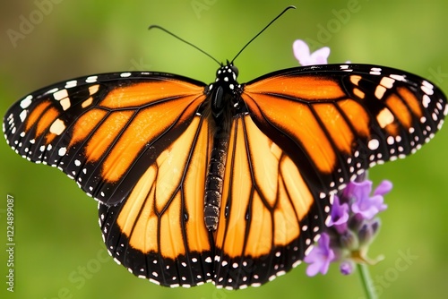 © Nico, Fototapeta premium Butterfly on a Flower A monarch butterfly perched on a purple lavender flower under soft sunlight.