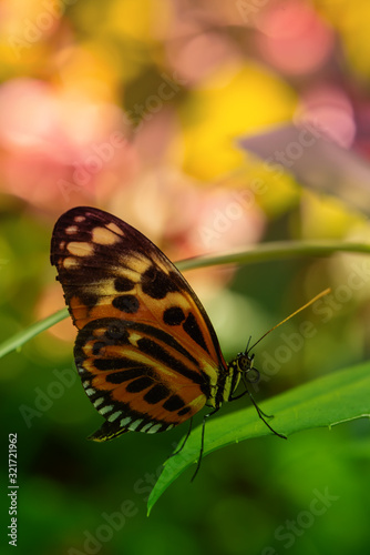 © emotionpicture, Obraz premium Butterfly on a leaf. Bokeh background with flowers