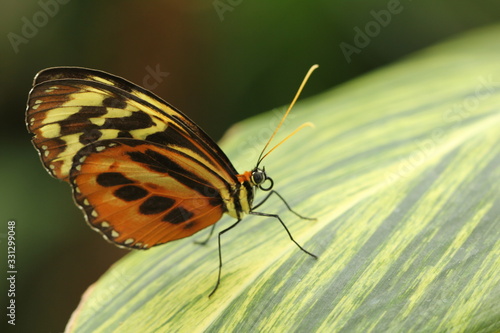 © Spring, Obraz premium Butterfly on a variegated tropical leaf.