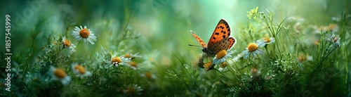 © trisnawati, Obraz premium Butterfly on daisies in green field nature scene artistic composition