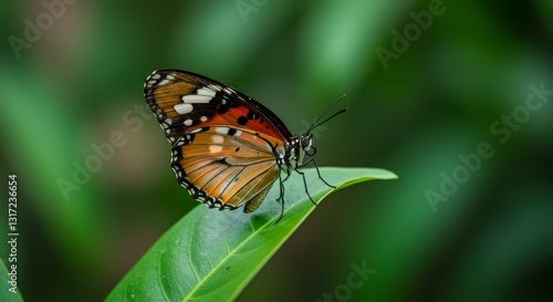 Fototapeta premium Butterfly on Leaf Vibrant Green Background - A vibrant orange and black butterfly rests gently on a lush green leaf, symbolizing nature, tranquility, transformation, beauty, and freedom