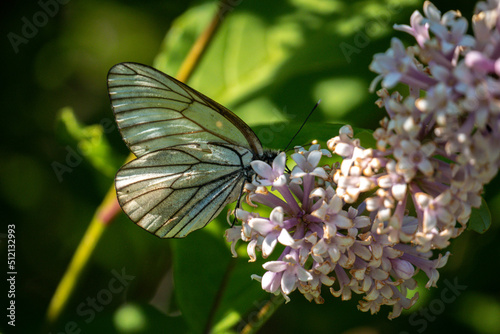 © Michel F, Naklejka premium Butterfly on lilac flowers. Butterfly on a branch close-up.
