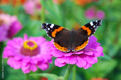 Naklejka premium Butterfly on pink Zinnia Elegans flower - bright summer nature photo