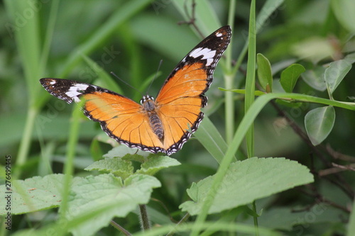 Fototapeta premium Butterfly on sand with green leafs and grass closeup
