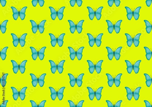© Iryna, Fototapeta premium Butterfly. Pattern with butterflies. Blue butterfly and yellow background. Nature. Summer season