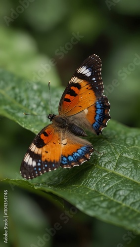 Obraz premium Butterfly perched on a green leaf.