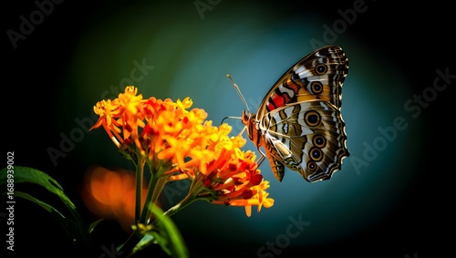 © Haish, Obraz premium Butterfly perched on bright orange flowers with a dark and moody background image is nice